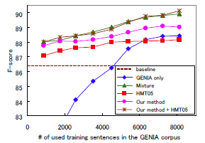Without re-training the model, Enju gave the parsing accuracy of 86.39 in F-score, which was 3.42 point lower than the one Enju gave for the original domain, the Penn Treebank. This is the baseline accuracy of the experiments. The "Mixture" method could obtain the highest level of the parsing accuracy for any size of the GENIA treebank while it required too much training cost. We would like to obtain the accuracy at least as high as the method, with as low cost as possible.